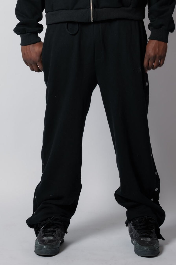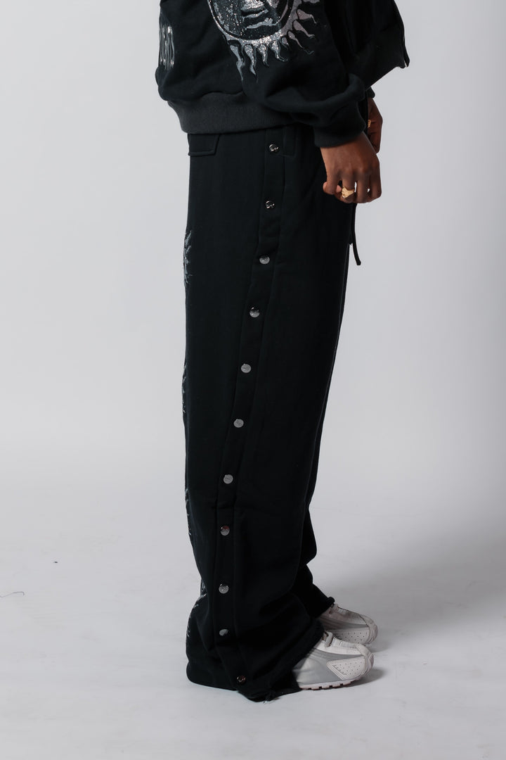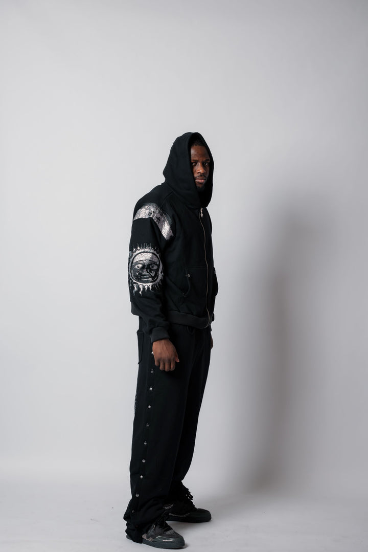 The A SERIES OF THOUGHTS track pants are designed to make a statement. Featuring intricate, metallic sun motifs running down the legs, these pants seamlessly blend comfort and style. Made from soft, durable material, they offer a relaxed fit with an elastic waistband and drawstring for adjustable comfort. Side pockets provide practicality, while the bold embroidery ensures a unique, standout look. Pair them with the matching sweater or your favorite top for a casual yet artistic outfit.