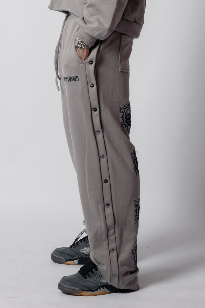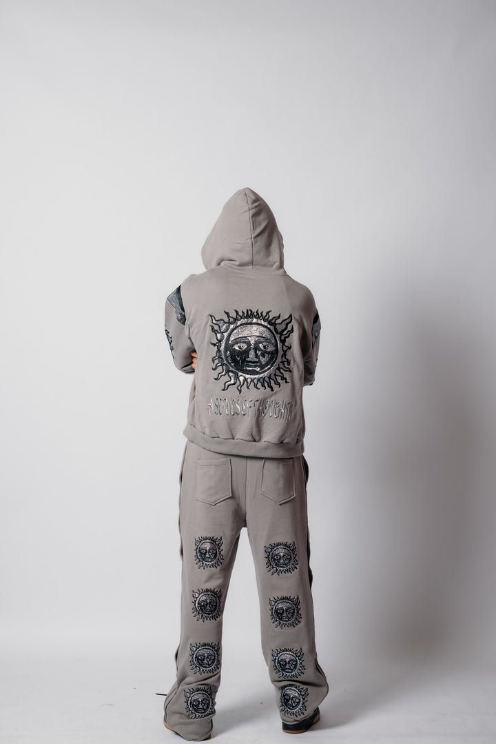 The A SERIES OF THOUGHTS track pants are designed to make a statement. Featuring intricate, metallic sun motifs running down the legs, these pants seamlessly blend comfort and style. Made from soft, durable material, they offer a relaxed fit with an elastic waistband and drawstring for adjustable comfort. Side pockets provide practicality, while the bold embroidery ensures a unique, standout look. Pair them with the matching sweater or your favorite top for a casual yet artistic outfit.