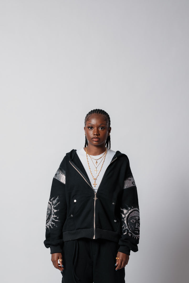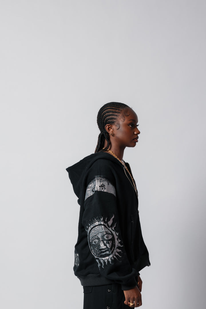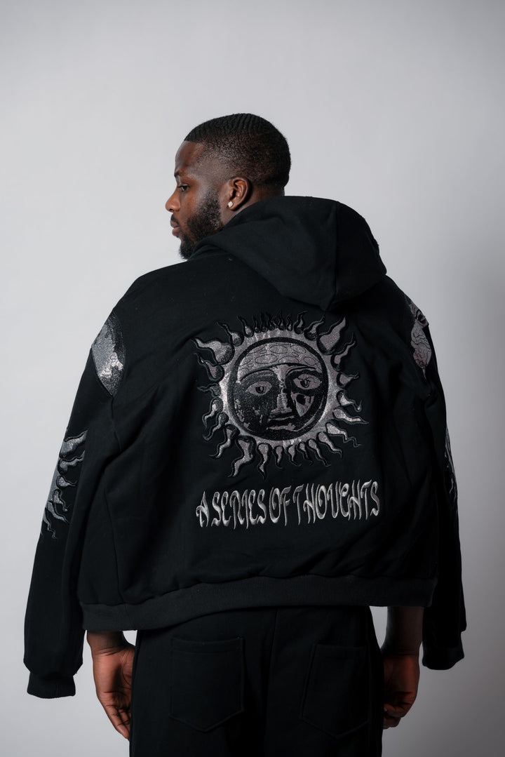 The A SERIES OF THOUGHTS sweater combines bold, celestial-inspired design with unmatched comfort. Crafted from high-quality, breathable fabric, this zip-up hoodie features striking metallic silver embroidery showcasing a radiant sun motif on the back and eye-catching celestial patterns on the sleeves. The oversized fit and deep hood add a relaxed, streetwear vibe while ensuring warmth and versatility for all-day wear. Perfect for layering, this statement piece is ideal for those looking to express themselves boldly.