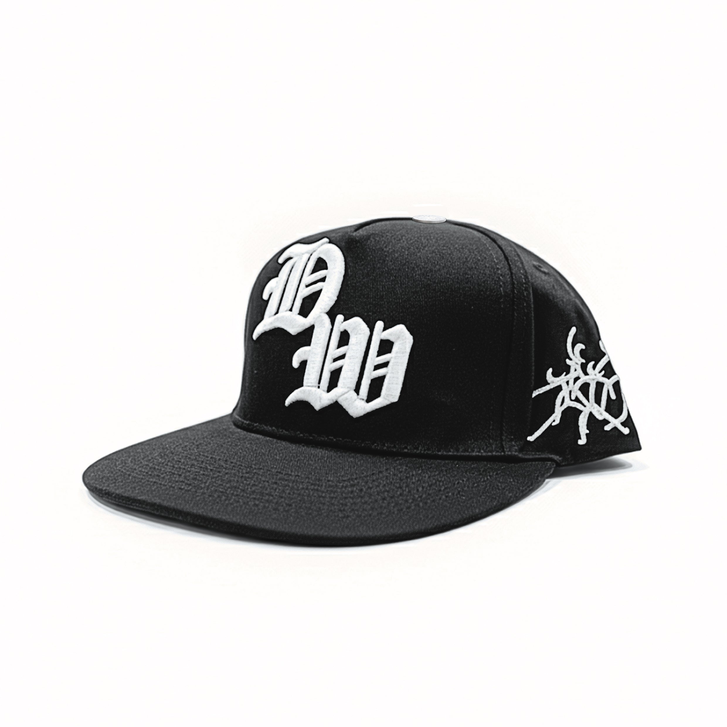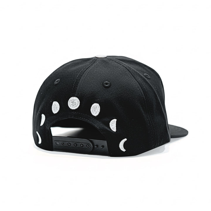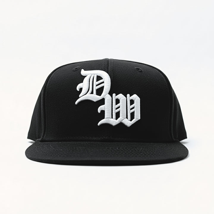 Stand out with the DW Snapback, featuring bold old English embroidery, side detailing, and moon phase artwork on the back. Made with durable fabric and an adjustable fit, this black snapback blends style and comfort—perfect for streetwear, festivals, or everyday wear.
